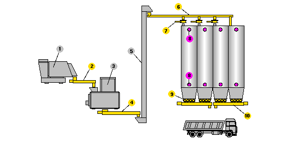 1 - loupací stroj, 2 - bezhřídelový spirální dopravník, 3 - Lis, 4 - bezhřídelový spirální dopravník, 5 - korečkový dopravník, 6 - bezhřídelový spirální dopravník, 7 - šoupátková klapa, 8 - indikátor hladiny, 9 - vibrační dno, 10 - žlabový šnekový dopravník --- Dodáváme pouze výrobky označené barevně --- (žlutě, červeně, modře, zeleně, atd.)