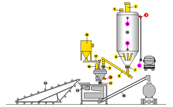 1 - škrtící ventil, 2 - koleno EXTRABEND?, 3 - prachový filtr SILOTOP?, 4 - pojistný ventil, 5 - indikátor hladiny, 6 - provzdušňovací desky, 7 - motýlová klapa, 8 - cementový šnekový podavač, 9 - motýlová klapa, 10 - odvětrávací filtr HOPPERJET?, 11 - elektropneumatické kladivo, 12 - motýlová klapa, 13 - stírač, 14 - násypka váhy, 15 - pásový dopravník, 16 - odprašovací filtr DRYBATCH?, 17 - cementový šnekový podavač, 18 - sila na cement a plnivo --- Dodáváme pouze výrobky označené barevně --- (žlutě, červeně, modře, zeleně, atd.)