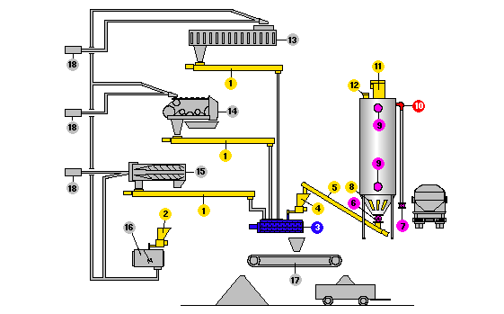 1 - bezhřídelový spirální dopravník, 2 - mikrodávkovač FLEXFLO, 3 - dvouhřídelová lopatková míchačka, 4 - mikrodávkovač, 5 - trubkový šnekový dopravník, 6 - rotační ventil, 7 - škrtící ventil, 8 - provzdušňovací desky, 9 - indikátor hladiny, 10 - koleno EXTRABEND?, 11 - prachový filtr SILOTOP?, 12 - pojistný ventil, 13 - lis, 14 - pásový lis, 15 - centrifuga, 16 - rozpouštěcí nádrž, 17 - pásový dopravník, 18 - kalové čerpadlo --- Dodáváme pouze výrobky označené barevně --- (žlutě, červeně, modře, zeleně, atd.)