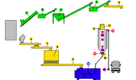 1 - šneková pumpa, 2 - lis WASTEMASTER?, 3 - oddělovač písku, 4 - lis WASTEMASTER?, 5 - bezhřídelový spirální dopravník, 6 - bezhřídelový spirální dopravník, 7 - bezhřídelový spirální dopravník, 8 - vibrační dno, 9 - bezhřídelový spirální dopravník, 10 - kontinuální radlicová míchačka, 11 - pojistný ventil, 12 - válcový prachový filtr WAMECO?, 13 - koleno EXTRABEND?, 14 - indikátor hladiny, 15 - vibrační dno, 16 - šoupátková klapa, 17 - škrtící ventil, 18 - silo s vápnem --- Dodáváme pouze výrobky označené barevně --- (žlutě, červeně, modře, zeleně, atd.)