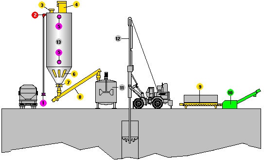 1 škrtící ventil, 2 koleno EXTRABEND?, 3 pojistný ventil, 4 válcový prachový filtr WAMECO?, 5 indikátor hladiny, 6 provzdušňovací desky, 7 motýlová klapa, 8 trubkový šnekový dopravník, 9 bezhřídelový spirální dopravník, 10 lis WASTEMASTER?, 11 rozpouštěcí nádrž, 12 síto --- Dodáváme pouze výrobky označené barevně --- (žlutě, červeně, modře, zeleně, atd.)