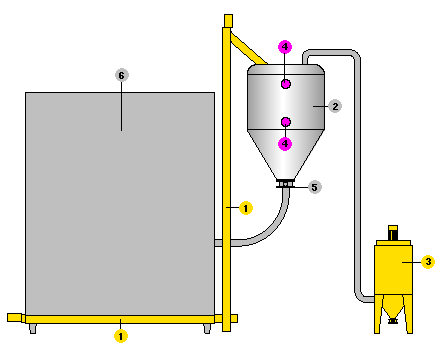 1 - vertikální šnekový dopravník WAVER?, 2 - násypka, 3 - válcový prachový filtr WAMECO?, 4 - indikátor hladiny, 5 - vstřikovací systém, 6 - otryskávací komora --- Dodáváme pouze výrobky označené barevně --- (žlutě, červeně, modře, zeleně, atd.)