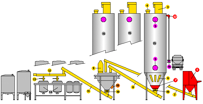 1 - ruční rozpytlovačka, 2 - trubkový šnekový dopravník, 3 - válcový prachový filtr WAMECO?, 4 - pojistný ventil, 5 - indikátor hladiny, 6 - provzdušňovací desky, 7 - vibrační dno, 8 - trubkový šnekový dopravník, 9 - odvětrávací filtr HOPPERJET?, 10 - motýlová klapa, 11 - trubkový šnekový dopravník, 12 - trubkový šnekový dopravník, 13 - šoupátková klapa, 14 - rozpouštěcí nádrž, 15 - sila, 16 - škrtící ventil, 17 - koleno EXTRABEND?, 18 - elektropneumatické kladivo --- Dodáváme pouze výrobky označené barevně --- (žlutě, červeně, modře, zeleně, atd.)