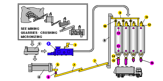 1 - pec, 2 - kontinuální radlicová míchačka, 3 - mikrodávkovač, 4 - prachový kolektor, 5 - žlabový šnekový dopravník, 6 - rotační ventil, 7 - žlabový šnekový dopravník, 8 - korečkový dopravník, 9 - žlabový šnekový dopravník, 10 - motýlová klapa, 11 - válcový prachový filtr WAMECO?, 12 - pojistný ventil, 13 - indikátor hladiny, 14 - provzdušňovací desky, 15 - motýlová klapa, 16 - plnící hubices BELLOJET? --- Dodáváme pouze výrobky označené barevně --- (žlutě, červeně, modře, zeleně, atd.)