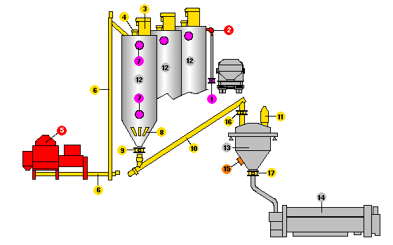 1 - škrtící ventil, 2 - koleno EXTRABEND?, 3 - prachový filtr SILOTOP?, 4 - pojistný ventil, 5 - automatická rozpytlovačka, 6 - vertikální šnekový dopravník WAVER?, 7 - indikátor hladiny, 8 - provzdušňovací desky, 9 - motýlová klapa, 10 - trubkový šnekový dopravník, 11 - odvětrávací filtr HOPPERJET?, 12 - sila, 13 - násypka váhy, 14 - protlačovací lis, 15 - elektropneumatické kladivo, 16 - motýlová klapa, 17 - motýlová klapa --- Dodáváme pouze výrobky označené barevně --- (žlutě, červeně, modře, zeleně, atd.)