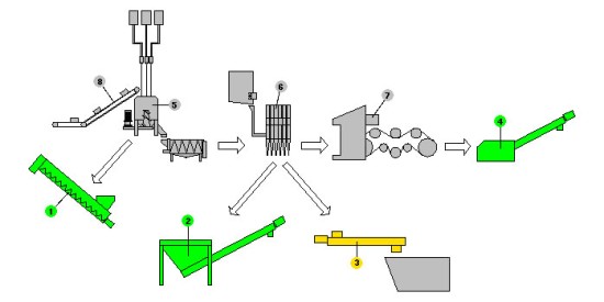 1 - separátor DRYJECT?, 2 - oddělovač písku GRITSEP?, 3 - bezhřídelový spirální dopravník, 4 - lis WASTEMASTER?, 5 - rozvlákňovač, 6 - čističe, 7 - papírenský stroj, 8 - pásový dopravník --- Dodáváme pouze výrobky označené barevně --- (žlutě, červeně, modře, zeleně, atd.)