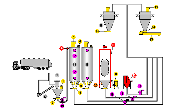 1 - válcový prachový filtr WAMECO?, 2 - cyklon, 3 - šoupátková klapa, 4 - koleno EXTRABEND?, 5 - válcový prachový filtr WAMECO?, 6 - pojistný ventil, 7 - indikátor hladiny, 8 - provzdušňovací desky, 9 - šoupátková klapa, 10 - FIBC vyprazdňovače, 11 - válcový prachový filtr WAMECO?, 12 - ruční rozpytlovačka, 13 - válcový prachový filtr WAMECO?, 14 - šoupátková klapa, 15 - trubkový šnekový dopravník, 16 - násypka váhy, 17 - pásový dopravník, 18 - silo, 19 - antiexplozívní rotační ventil, 20 - provzdušňovací kladivo PICJET? --- Dodáváme pouze výrobky označené barevně --- (žlutě, červeně, modře, zeleně, atd.)